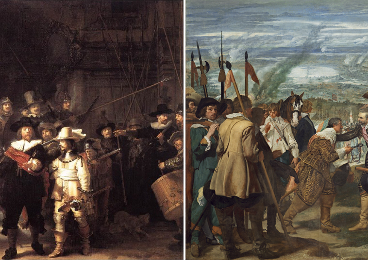 Texte écrit par Patrice Giorda qui met en rapport deux tableaux, celui de Velasquez "La Réddition de Breda" (1635) et de Rembrandt "La Ronde de Nuit" (1642)