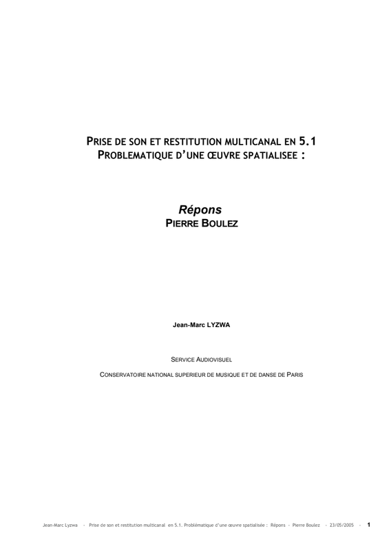 « Répons ne renvoie pas seulement au dialogue entre les solistes et l’ensemble, au dialogue des solistes entre eux, au dialogue de ce qui est transformé et de ce qui ne l’est pas, mais aussi au dialogue de plusieurs matériaux. »Pierre Boulez