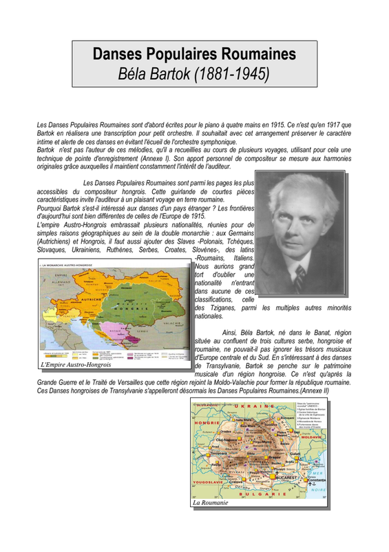 Béla Bartók, né le 25 mars 1881 en Autriche-Hongrie dans le Banat à Nagyszentmiklós , mort le 26 septembre 1945 à New York, est un compositeur et pianiste hongrois. Pionnier de lâethnomusicologie, il enregistra sur le vif nombre de morceaux de musique folklorique dâEurope de l'Est. Il est influencé à ses débuts par Richard Strauss, Liszt et Brahms dans le style tzigano-hongrois du verbunkos; puis sa découverte de Debussy et des chants paysans slaves l'oriente vers un nouveau style très personnel où sont intégrées les découvertes de Stravinsky et Schönberg. Pédagogue de renom, il restera toute sa vie profondément attaché à sa terre natale : « Pour ma part, durant ma vie entière, en tout lieu, en tout temps et de toute façon, je veux servir une seule cause, celle du bien de la patrie et de la nation hongroise ».